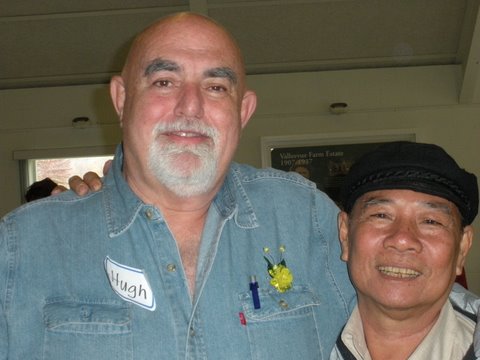 Former enemies. Hugh S., aka Sugarbear, was a helicopter gunship door gunner in Vietnam. Lam Van Tien was a Vietnamese schoolteacher until American bombs destroyed his village. Then he became a Vietcong. Lam was seriously wounded by a gunship's gunner in 1968 at Rach Kien. Sugarbear was wounded by VC ground fire in the same place, the same year. The two old foes met at a recent international conference, learned what they had in common, and joked that if they had shot each other they were glad they hadn't been better shots.